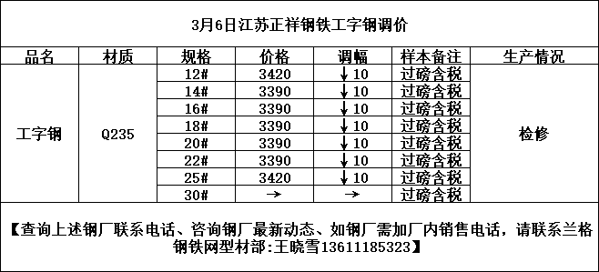• 3月6日江苏正祥钢铁工字钢调价信息