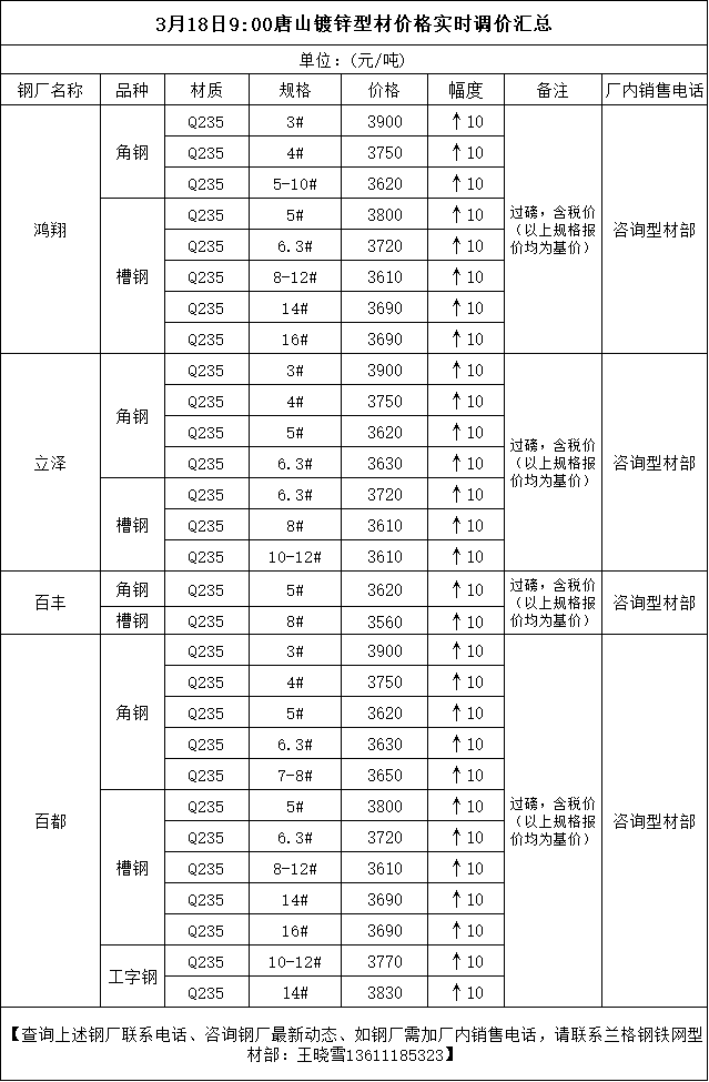 • 3月18日(9:00)唐山镀锌型材价格实时调价汇总