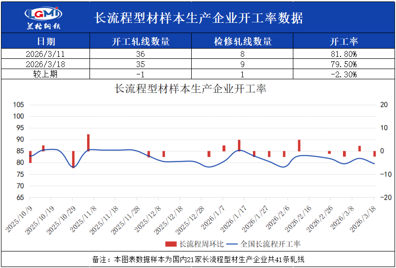 截至3月18日16:00,兰格钢铁网统计国内21家长流程样本生产企业共44条型钢轧线,在产35条,停产9条,开工率为79.5%,较上周下降2.3%。