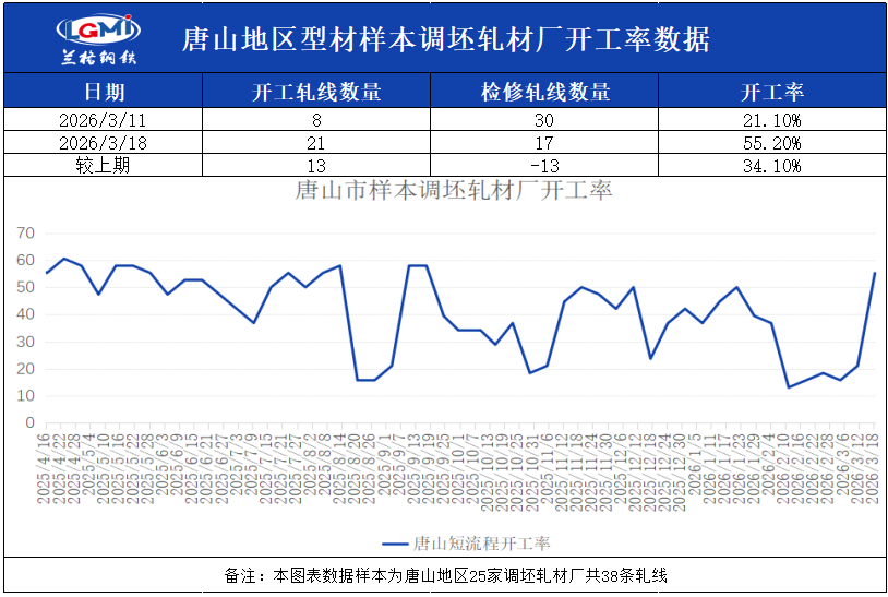 兰格钢铁网统计唐山24家样本轧钢企业共38条轧线,在产21条,停产17条,停产轧线数较上周减少13条,开工率为55.2%,较上周上升34.1%。