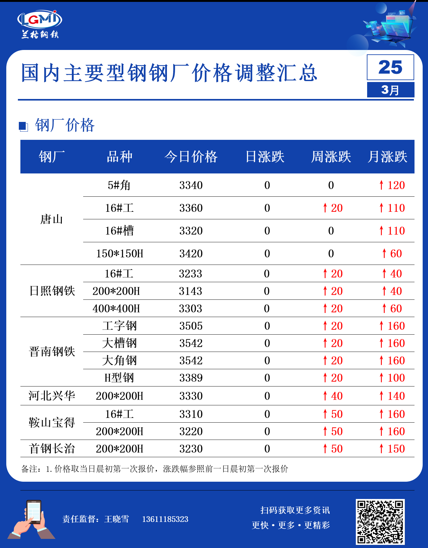 • 3月25日(9:00)唐山型钢厂槽钢实时调价汇总