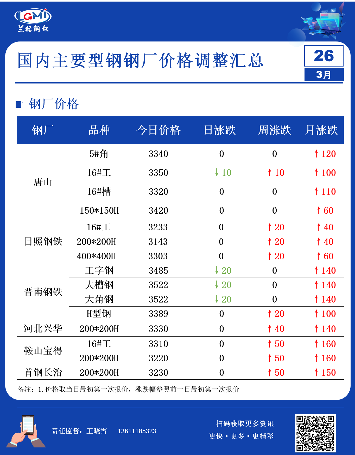 • 3月26日(9:00)唐山型钢厂槽钢实时调价汇总