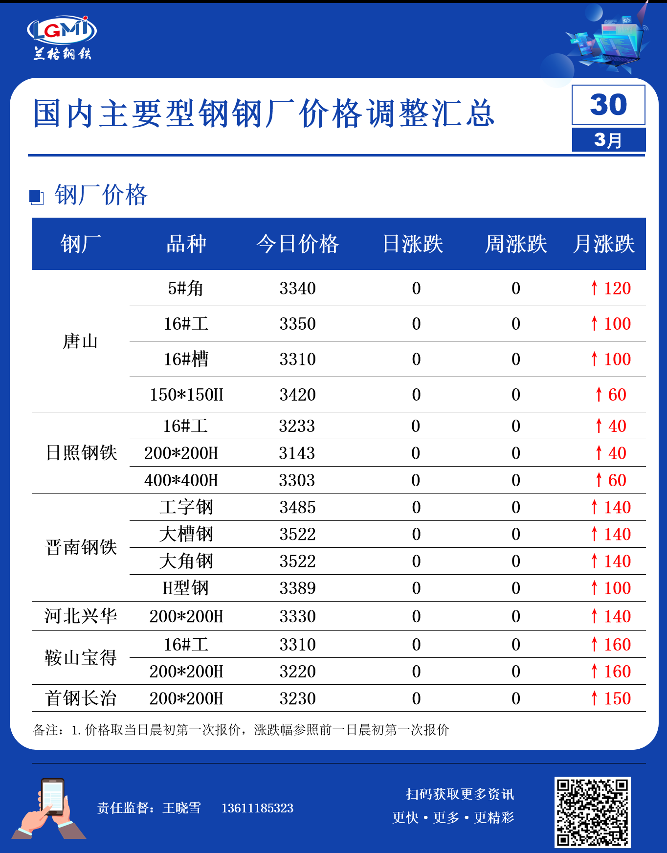 • 3月30日(9:00)唐山型钢厂槽钢实时调价汇总