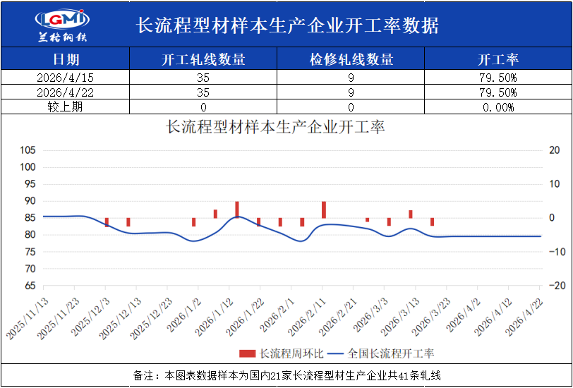截至4月22日16:00,兰格钢铁网统计国内21家长流程样本生产企业共44条型钢轧线,在产35条,停产9条,开工率为79.5%,较上周不变。