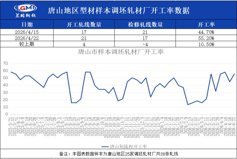 兰格钢铁网统计唐山24家样本轧钢企业共38条轧线,在产21条,停产17条,停产轧线数较上周减少4条,开工率为55.2%,较上周上升10.5%。