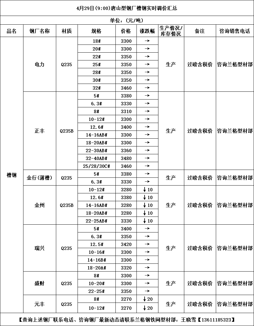 • 4月29日(9:00)唐山型钢厂槽钢实时调价汇总